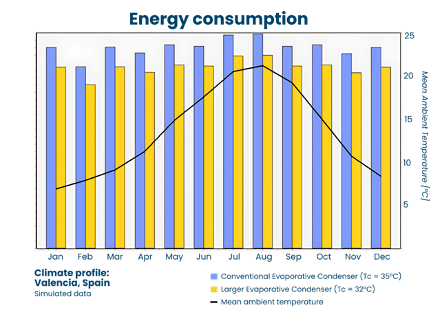 Permite la condensación a 32°C, ahorrando hasta un 9% de energía en comparación con los sistemas tradicionales.